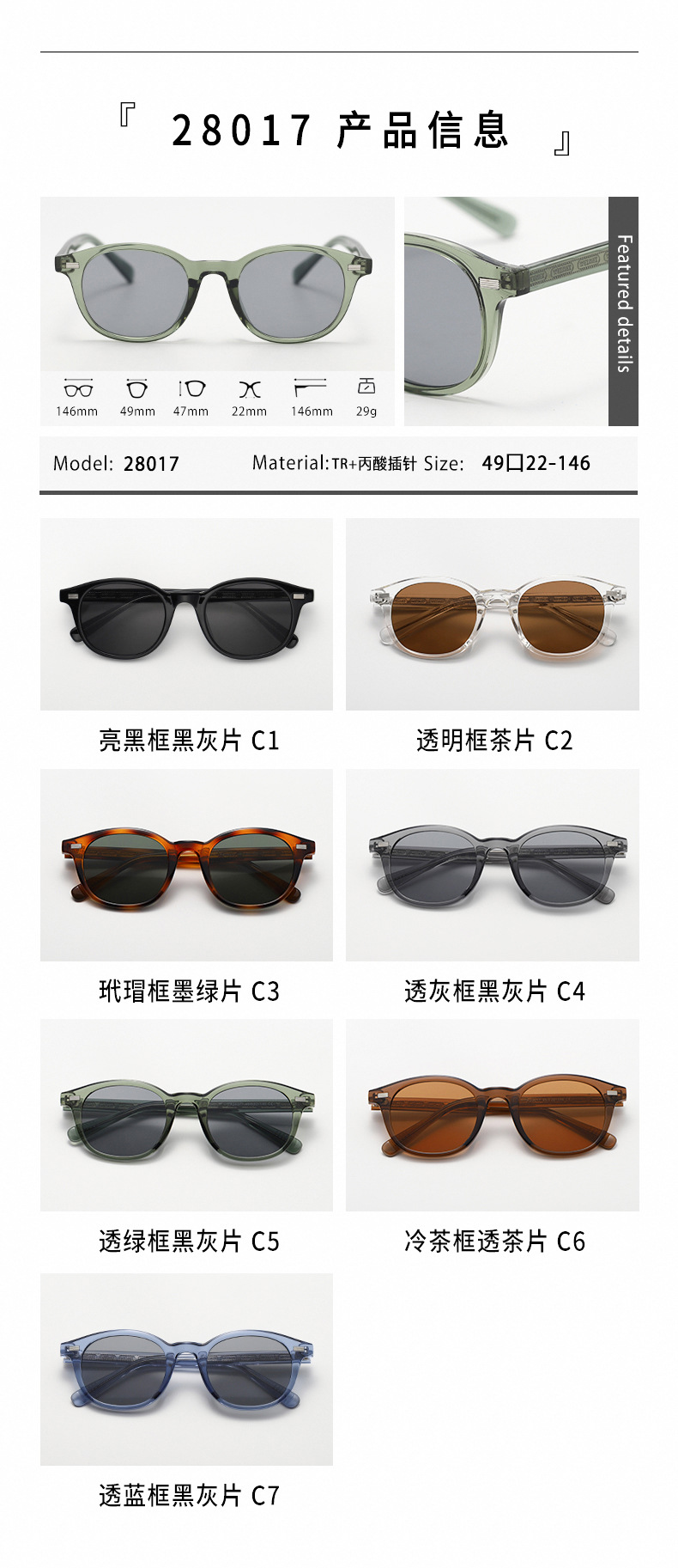 Colors: bright black frame black gray lens/C1, transparent frame tea lens/C2, tortoiseshell frame dark green lens/C3, transparent gray frame black gray lens/C4, transparent green frame black gray lens/C5, cool tea frame transparent tea lens/C6, transparent blue frame black gray lens/C7